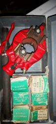 Novi nosači za cilindrične šmirgle. Prečnik bubnja na nosaču 12,45 mm. Jačina stezanja šmirgle može da se reguliše preko šrafa na vrhu. Tri i više nosača za 500 dinara.