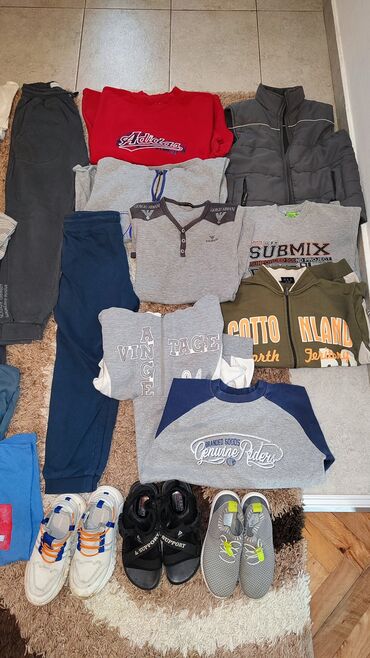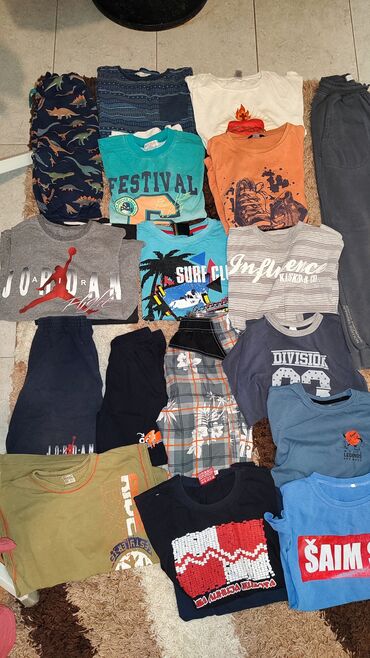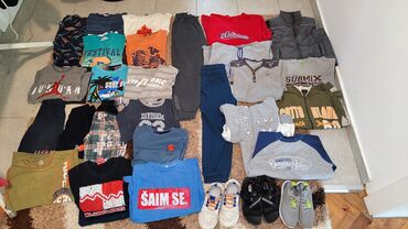 Veliki paket dečije garderobe 134 velicina i obuće (dečak 8 god). sa leve strane su kratki rukavi a sa desne su dugi Različiti komadi za proleće/jesen i leto.