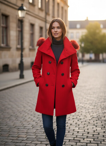 Crveni ženski kaput sa kapuljačom i krznom - Elegantna crvena boja -
