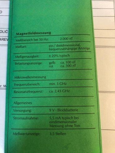 Profesionalni uređaj (detektor) za merenje magnetnog polja; Tehnički podaci su dati na slikama; Merna jedinica - nT (nanotesla); Potpuno NOVO, u orginalnom pakovanju; Made in Germany; Uplatu možete izvršiti pouzećem, plaćanjem kuriru prilikom isporuke ili uplatom pre slanja na tekući račun. Uplatom pre slanja štedite jer izbegavate poštarinu za povrat novca preko kurirske službe. Manji predmeti se mogu poslati u vrednosnom pismu kao preporučena pošiljka i to samo posle prethodne uplate. U slučaju da ste iz bilo kog razloga nezadovoljni proizvodom možete vratiti proizvod u roku od 15 dana i novac ćete dobiti nazad. Sve troškove slanja proizvoda snosi kupac ako se prethodno ne dogovori drugačije.