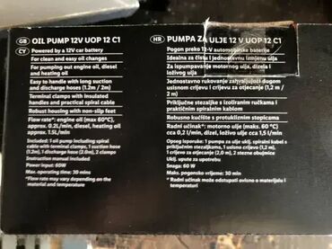 Pumpa za pretakanje / istakanje motornog ulja ili dizel goriva; Napajanje 12V DC; Istakanje se vrši kroz cev merača nivoa ulja; Ultimate Speed; Made in Germany; NOVO, sa garancijom (3 godine sa fiskalnim računom)! Ova prenosiva, lagana električna pumpa za dizel je laka za upotrebu i transport. Samousisna 12V pumpa se pričvršćuje za kleme akumulatora pomoću štipaljki. Odvodi ulje iz motora kroz cev za merenje nivoa ulja. Pogodan „uradi sam“ - štedi novac na skupim promenama ulja. Uključuje ulazna i izlazna creva. 12V DC 60W. Brzina protoka ulja: 0,8 litara/min na 60° C (neophodno je zagrejati motor odnosno ulje pre početka istakanja) Protok dizela: 1,8 litara/min na 23° C. Plaćanje možete izvršiti pouzećem ili uplatom pre slanja na tekući račun. Uplatom pre slanja izbegavate poštarinu za povrat novca preko kurirske službe. U slučaju da ste iz bilo kog razloga nezadovoljni proizvodom možete ga vratiti u roku od 15 dana i novac ćete dobiti nazad. Rizik i troškovi slanja idu na teret kupca (kod prijema i kod povrata proizvoda).