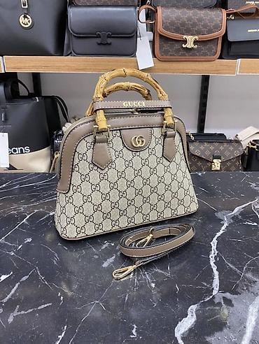 - Bež GG monogram torba sa bambus ručkom: klasičan GG platno dezen u bež/taupe tonovima, zlatni metalni detalji i GG logo sprijeda, gornji rajsferšlus, dodatni dugi kaiš za nošenje preko ramena ili crossbody. Struktuisan trapez oblik, ojačani ivici i kožni paneli.