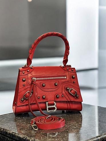 - Crvena struktuisana torba sa metalnim “B” inicijalom: mat koža sa ukrasnim šavovima i nitnama, prednji džep na rajsferšlus, kratka pletena ručka i dugi odvojivi kaiš za rame/crossbody. Antik finiš metalnih delova.