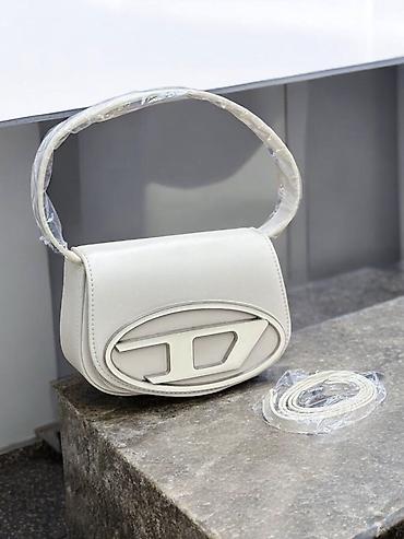 - Bela mini torba sa velikim ovalnim logotipom sprijeda: glatka tekstura, zaobljen poklopac, kratka ručka za nošenje u ruci i zaseban dugi kaiš u kompletu. Minimalistički dizajn, svetlosrebrni detalji.