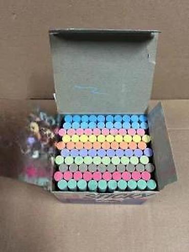 - Kutija s većim pakovanjem štapića krede u više boja (plava, žuta, narandžasta, zelena, roze, siva…).