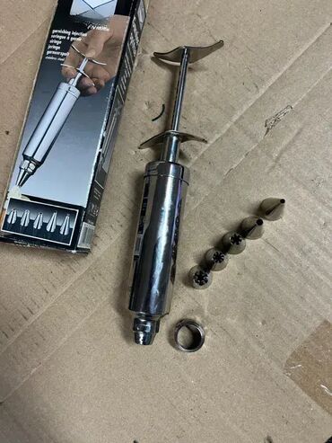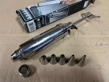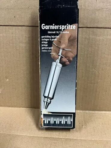 Špric za ukrašavanje torti i kolača - PROFI; Materijal INOX 18/10; 5 različitih mlaznica; KUCHENPROFI Germany; Potpuno NOVO, nekorišteno! Prekrasna dekoracija je završni detalj vašim tortama, desertima i hladnim platama. PROFI šprica za dekoraciju od KÜ CHENPROFI-ja vam pomaže u tome. Sa 5 različitih mlaznica, uključujući zvijezde, rozete i listove, nijedna dekorativna želja ne ostaje neispunjena. Šprica za dekoraciju je također korisna za punjenje krofni ili kremastog testa. Posuda se brzo puni filom, a šipka za presu se može lako pritisnuti. Zahvaljujući lako uklonjivom bajonetnom zatvaraču, možete umetnuti mlaznice za ukrašavanje i mlaznice za dekoraciju u samo nekoliko koraka.