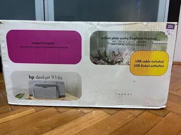 *** SUPER AKCIJA *** #2992 Inkjet štampač u boji, HP DeskJet 916c; Komplet sa novim ketridžima; **Potpuno NOVO, neotpakovano u stiroporu!** _Opis:_ _HP Deskjet 916C je kompaktan i moćan inkjet foto štampač._ _Može da štampa maksimalno 9 stranica u minuti crno-belo i 7,5 stranica u minuti u boji._ _Dizajn 916C je prilično impresivan, jer se njegove ulazne i izlazne kasete za papir mogu sklopiti, smanjujući njegov prostor._ _Ulazna kaseta za papir može da primi do 100 listova istovremeno._ _Kontrolna tabla je veoma osnovna, sa dugmetom za otkazivanje štampanja, dugmetom za napajanje i dugmetom za ručno ubacivanje papira._ _Ima indikatorsku lampicu koja upozorava korisnike da je potrebno zameniti mastilo za štampač Deskjet 916C._ _Podržani su i Mac i PC računari, a mašina se može povezati preko USB._ _Sistem koristi dva HP 916C kertridža: jedan crni i jedan trobojni._ _Za razliku od nekih modela, štampač će nastaviti sa radom čak i ako je jedan od Deskjet 916C kertridža prazan._