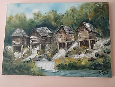 Ulje na platnu – pejzaž sa vodenicama - Motiv: niz starih drvenih