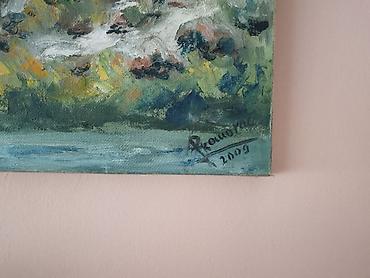 - Stil: realistički pejzaž sa impresionističkim pristupom teksturi i svetlu; dekorativno i toplo za dnevne sobe, hodnike ili radne prostore.