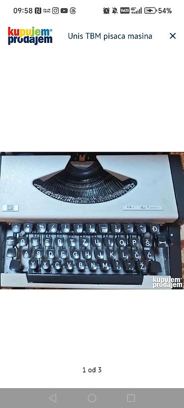 - UNIS TBM: kompaktna mehanička pisaća mašina sa standardnim latiničnim rasporedom i jugoslovenskim dijakriticima (č, ć, ž, š, đ). Tasteri jasno obeleženi, numerički i interpunkcijski znaci prisutni. Kućište u svetloj boji, mehanizam sa lepezastim segmentom i ručnim povratom kolica. Pogodna za kucanje dopisa, obrazaca i kreativno pisanje. Mehaničko podešavanje margina, ručno uvlačenje papira i rolna za traku.