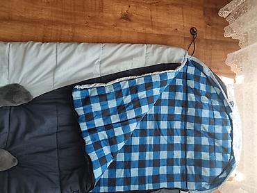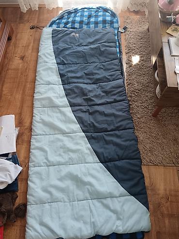 Vreća za spavanje OPEN AIR – pravougaonog oblika sa kapuljačom/učkurom. Spolja tamnosiva sa svetlom sivo-plavom aplikacijom, iznutra karirana postava (plavo-crni kvadrati). Topla, meka i komforna, pogodna za kampovanje, planinarenje, vikendice i gostinske noćenje.