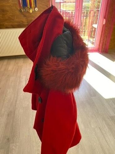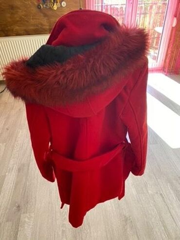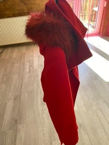 Ženski crveni kaput sa crnim krznenim ovratnikom/šalom. - Model: elegantan, ravnog kroja, dužina do kolena - Boja: intenzivno crvena - Detalji: veliki crni krzneni dodatak preko ramena i grudi (mo...