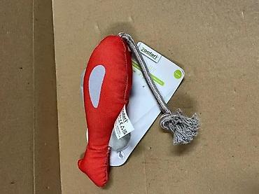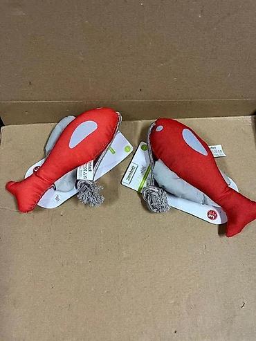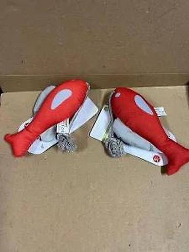 - Mekana plišana/pamučna igračka u obliku ribe, kombinacija crvene i sive boje sa reflektujućim tačkama.