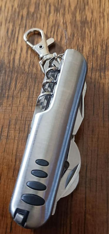 Kompaktan višenamenski alat sa metalnim kućištem i priveskom/karabinom za kačenje za ključeve ili ranac. Sadrži više funkcija za svakodnevnu upotrebu i outdoor aktivnosti.