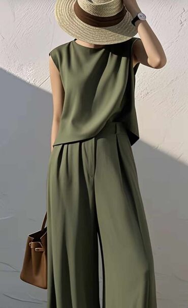 Damski komplet – crop jakna + široke pantalone - Moderan dvodelni set od mekog, prijatnog materijala sa blagim padom. - Gornji deo: kraća jakna sa rajsferšlusom po sredini, visokim okovratnikom i ...