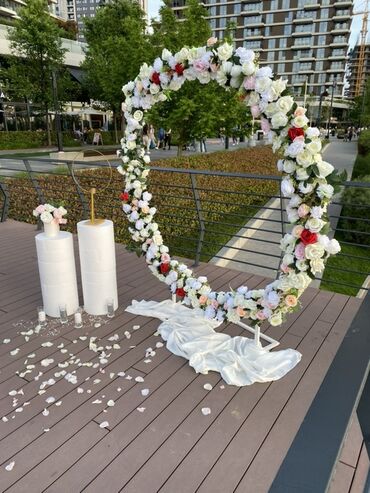 - Veliki kružni dekor od veštačkog cveća na stabilnom metalnom stalku. Prečnik približno 2,2–2,5 m, pogodan za venčanja, veridbe, rođendane, korporativne događaje i foto-zone na otvorenom i u zatvorenom.