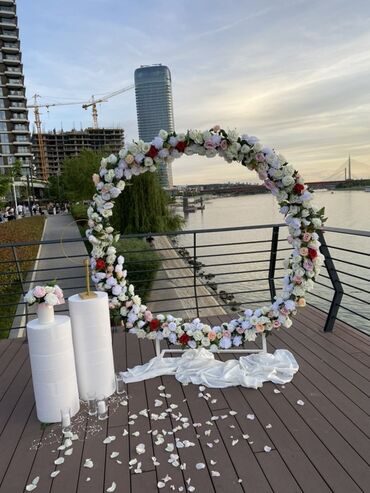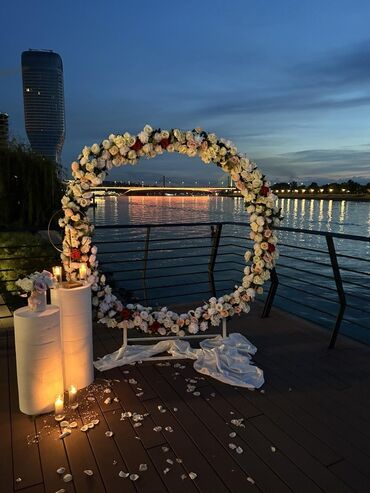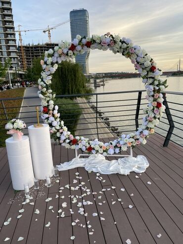 Set je vizuelno ujednačen i spreman kao kompletna foto-zona: portal + postolja + draperija + sveće + dekorativne latice i perlice. Lako se uklapa u gradske i prirodne ambijente, posebno uz vodu ili panoramske lokacije.