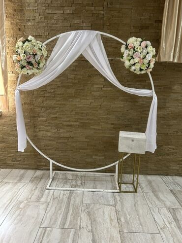 Dekorativni set za svečane događaje – kružni metalni luk sa cvetnim aranžmanima i stočićem