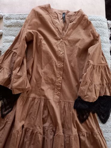 Žensko haljina/tunika u zlatno-braon boji sa sjajem. - Kroj: ravna silueta, dužina iznad kolena; 3/4 rukavi. - Izrez: širok okrugli izrez. - Materijal: rebrasti pleteni materijal sa diskretnim šlj...1 900 RSD