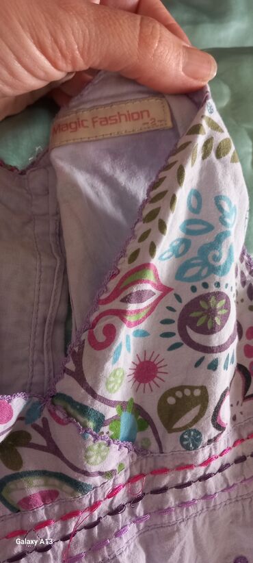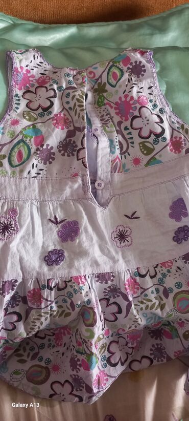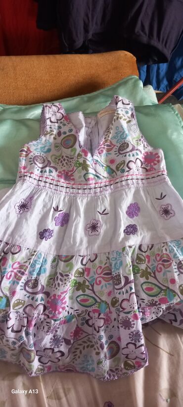 Dečija teksas haljinica sa tregerima i dezenom likova iz crtanog filma (razni svetliji otisci po celoj površini). - Materijal: lagani svetloplavi denim. - Kopčanje/namještanje: tregeri sa čvor-ve...