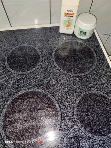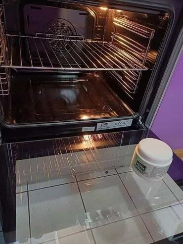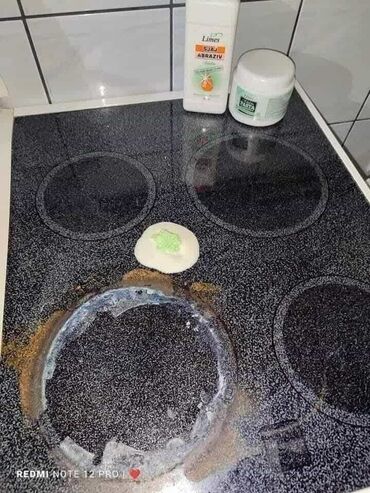 - Prikazano: pre/posle čišćenja staklokeramičke ploče i rerne – uklonjene bele i smeđe naslage oko grejnih zona i na staklu rerne.