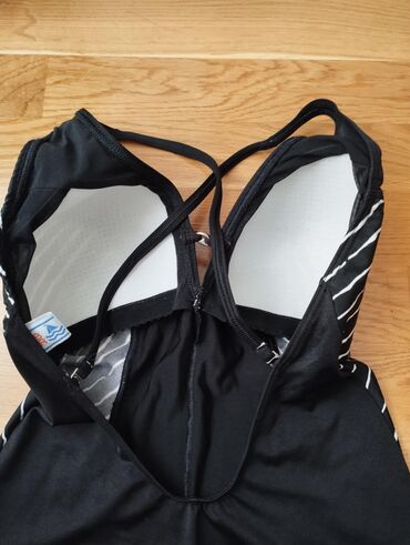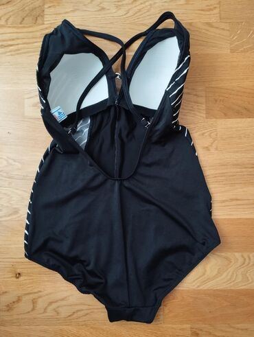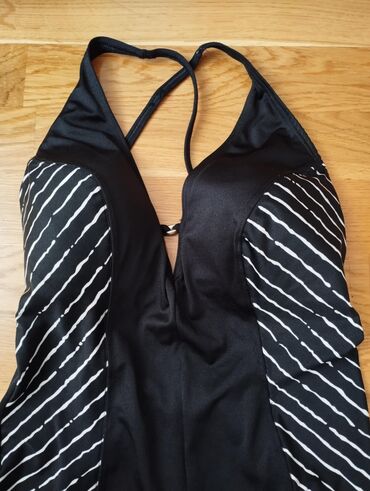 Jednodelni ženski kupaći kostim u crnoj boji sa detaljima u animal printu (leopard). - Dizajn: klasičan kroj sa V-izrezom napred i pravim leđima; dekorativna traka na dekolteu i bočni umetci u le...