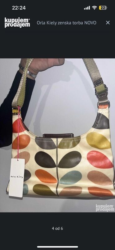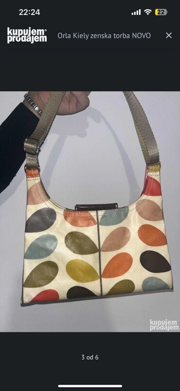 - Dimenzije (procena sa fotografija): približno torbica srednje veličine, pogodna za svakodnevne potrepštine (telefon, novčanik, ključevi, šminka)