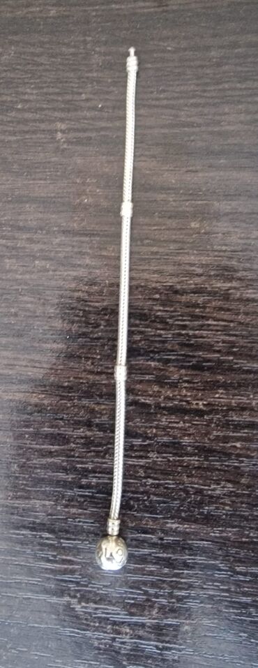 Pandora narukvica zmijskog lanca, izrađena od srebra. Karakteriše je zmijski lanac i elegantan detalj u obliku kuglice sa ugraviranim natpisom. Idealna za dodavanje priveska i personalizaciju, pogodna za svakodnevno nošenje ili posebne prilike. Jednostavan dizajn omogućava lako kombinovanje sa različitim stilovima i drugim nakitom.