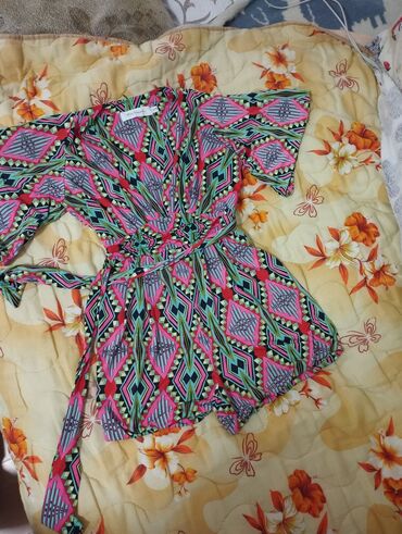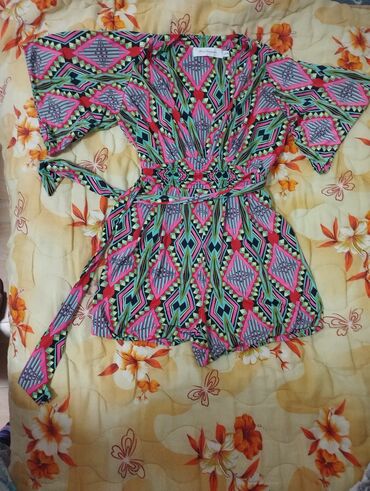 Elegantni kombinezon na preklop sa sitnim tačkicama i dekorativnom zlatnom kopčom. - Kroj: struk naglašen blagim naborima i asimetričnim preklopom - Dužina: iznad kolena - Materijal: meka, lagana ...