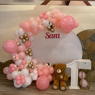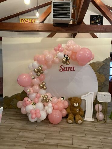 - Masivna balonska instalacija u nijansama roze, bele i zlatne: različite veličine balona, zlatni akcenti u obliku cvetića i dekorativno zelenilo/cvetići.