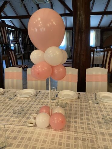 - Stojeći centar za stolove od balona u roze-beloj kombinaciji (jedan veliki balon sa manjim balonima na stalku, plus postolje od balona u podnožju).