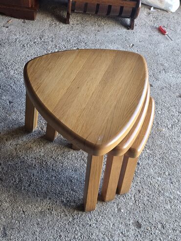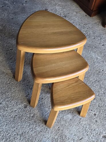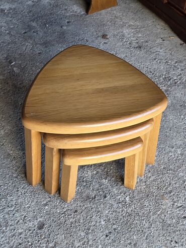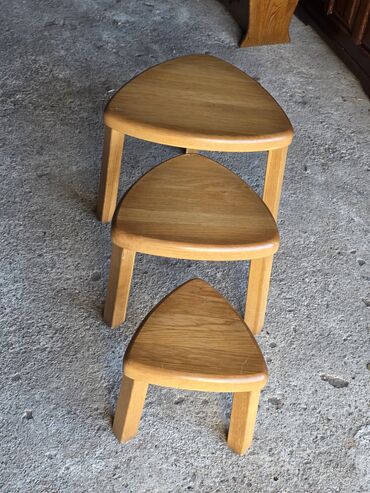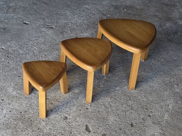 - Konstrukcija: po tri čvrste noge na svakom stočiću; stočići se mogu uvući jedan ispod drugog radi uštede prostora.