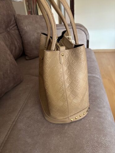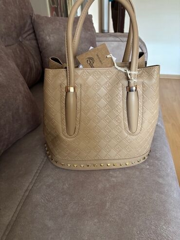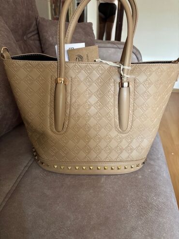 - Detalji: zlatni metalni akcenti na bazama ručki; niz sitnih zlatnih šiljaka/studova duž donje ivice torbe
