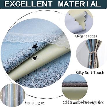 - Dizajn: elegantno obrađene ivice; nežna til/gaza kao prateći sloj na nekim panelima; višebojne vertikalne nijanse (plava, siva, krem) koje se lako uklapaju u enterijer.