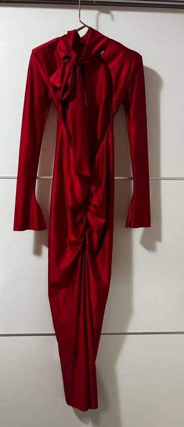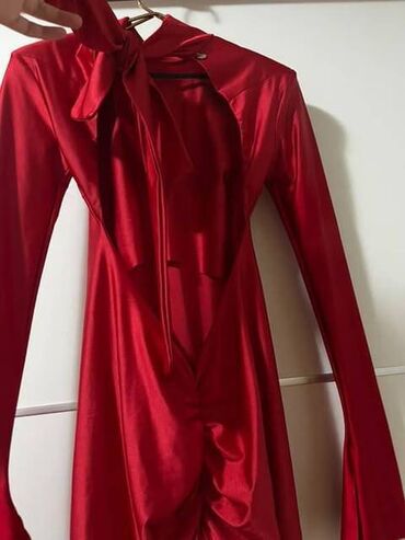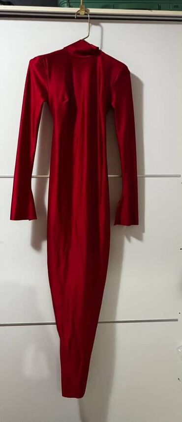 Elegantna duga crvena haljina od sjajnog, rastegljivog materijala.