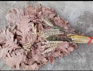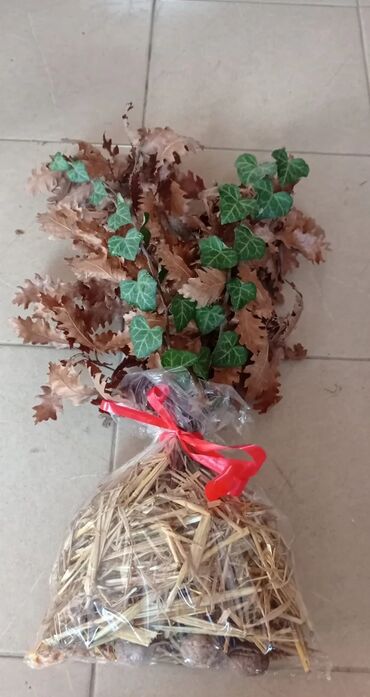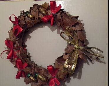 Ručno pravljeni božićni ukrasi od prirodnih materijala - Badnjak/arranžman od suvog hrastovog lišća, pšenice i mirisnih grančica, uvezan crvenom trakom. Pogodan za kućni sto, ikonu ili ulazna vrat...