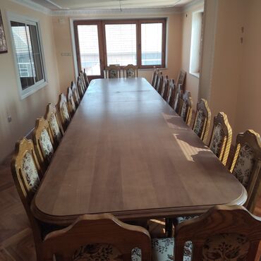 U kompletu: dugi trpezarijski sto + 18 odgovarajućih stolica u istom dezenu.