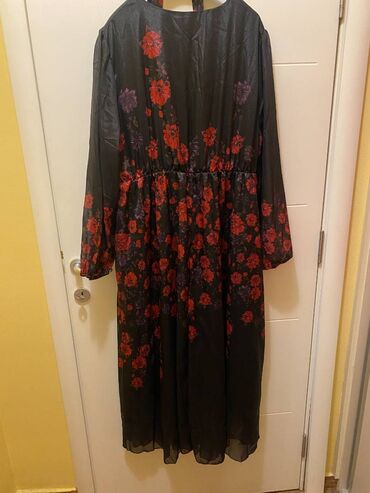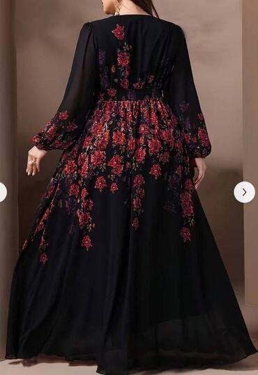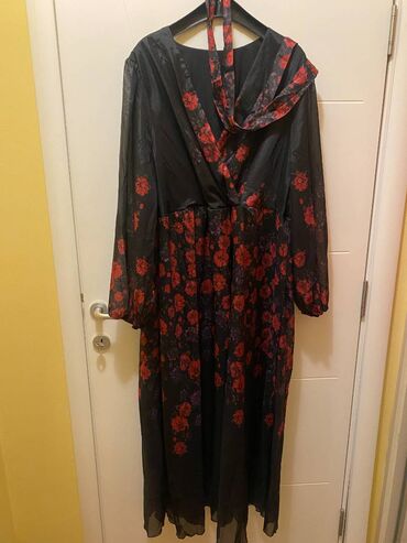 Dugačka maxi haljina sa romantičnim cvetnim printom na crnoj podlozi. Gornji deo je krojen na preklop sa V-izrezom, naglašava struk i spušta se u lepršavu suknju A-kroja. Rukavi su dugi, blago providni, sa skupljenim manžetnama. Materijal je lagan i lepršav, sa postavom ispod suknje koja obezbeđuje prijatan pad. Print čine crvene i ljubičaste cvetne grančice raspoređene od struka naniže i diskretno po gornjem delu. Dužina do poda, idealna za svečane prilike, večernje izlaske ili prolećno-jesenje događaje. U kompletu dolazi kaiš/pojas u istom dezenu za dodatno naglašavanje struka. Klasična elegancija uz udobnost i pokretljivost.