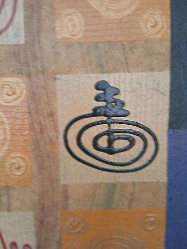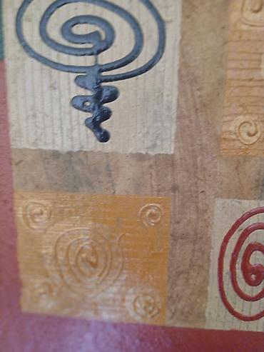 - Motiv: geometrijska kompozicija u kvadratnoj mreži (3x3), sa spiralama i linijskim simbolima u crnoj i crvenoj boji, kombinovanim sa utisnutim reljefnim spiralnim ornamentima