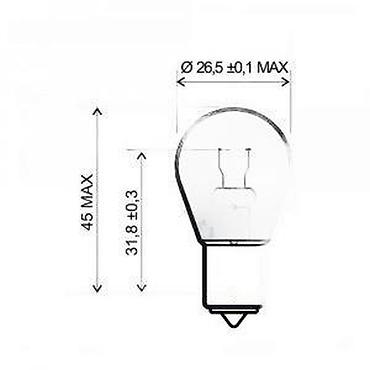 - Dimenzije: visina do 45 mm, prečnik balona 26,5 mm, dužina staklenog dela oko 31,8 mm (prema tehničkom crtežu)