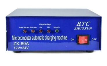 Pogodan za automobile, kombije, poljoprivredne i druge mašine sa 12V/24V akumulatorima. Automatsko upravljanje procesom punjenja uz zaštitu od grešaka u povezivanju. Kompaktno metalno kućište u plavoj boji. Model: ZX-80A, oznaka na uređaju: “Microcomputer automatic charging machine”.