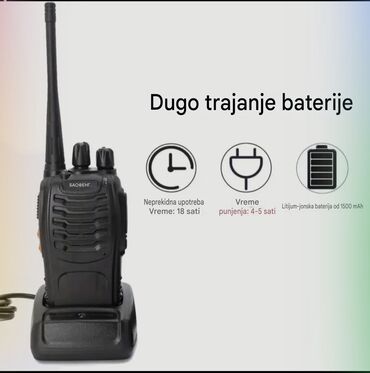 Robusno kućište sa bočnim naranžastim tasterima, jasno ozvučenje i pouzdana komunikacija na kratkim i srednjim udaljenostima. Idealno za timski rad na terenu, događaje, obezbeđenje, skladišta i outdoor aktivnosti. Set obuhvata četiri uređaja sa odgovarajućim baznim punjačima.