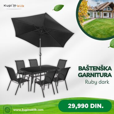 - Sastav: sto sa tamnom staklenom pločom + 6 stolica + veliki crni suncobran sa ručnim mehanizmom