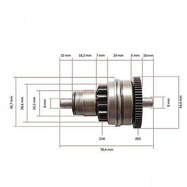 Bendix startera sa dimenzijama prikazanim na slici. Ovaj starter bendix ima zupčanike Z14 i Z63, sa ukupnom dužinom od 70,4 mm. Prečnik osovine je 8 mm. Komponenta je pogodna za različite primene u starter motorima, obezbeđujući pouzdan prenos snage.