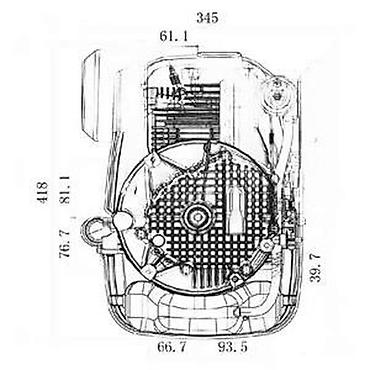 - Dimenzije sklopa (orijentaciono prema tehničkom crtežu): dužina oko 345 mm, širina oko 418 mm; ključna međuosovinska rastojanja i visine obeležena na crtežu radi ugradnje