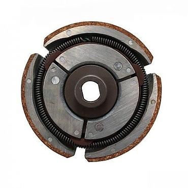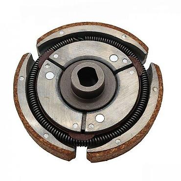 Centrifugalno kvačilo sa tri papuče, dizajnirano za automatsko spajanje i razdvajanje pogona. Sadrži tri frikcione papuče koje se aktiviraju oprugama. Centralni otvor je kvadratnog oblika, što omogućava precizno postavljanje na odgovarajuću osovinu. Izrađeno je od metala i frikcionog materijala, pogodno za upotrebu u malim motorima, kao što su oni u baštenskoj opremi ili manjim vozilima. Kompaktan i robustan dizajn obezbeđuje pouzdan rad i dugotrajnost.