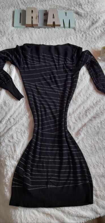 Džemper-haljina, veličina M. Tamno siva boja, dugi rukavi, drapirani karo izrez sa dekorativnim lančićima/perlicama preko grudi i ramena. Uska, elastična silueta koja prati liniju tela. Dimenzije:...1 700 RSD