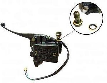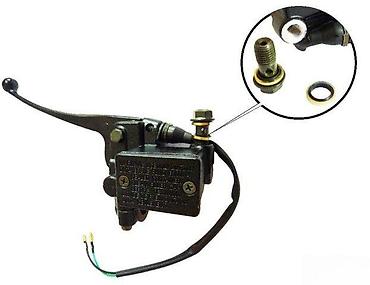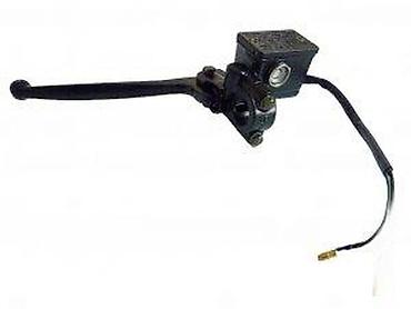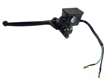 Crna ručica kočnice sa integrisanim glavnim kočionim cilindrom, dizajnirana za motocikle. Poseduje rezervoar za kočionu tečnost, ručicu i električne priključke, što ukazuje na funkciju prekidača kočionog svetla. Izrađena od metala, obezbeđuje pouzdanost i trajnost u radu. Kompletna jedinica je spremna za montažu, nudeći rešenje za zamenu ili nadogradnju kočionog sistema.