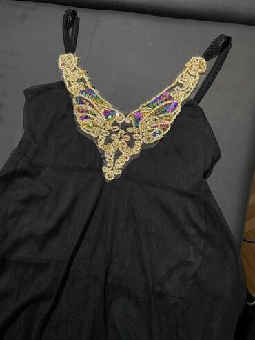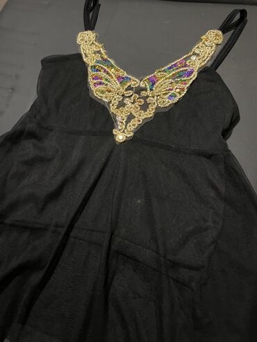 Crna ženska haljina/ tunika na bretele sa raskošnim ručno rađenim ukrasom na dekolteu.