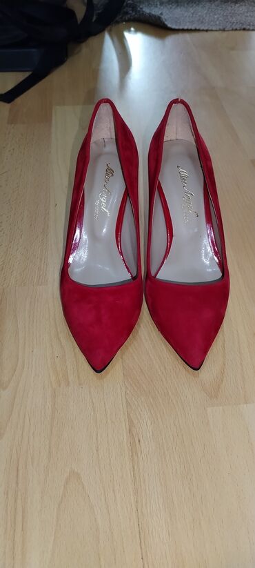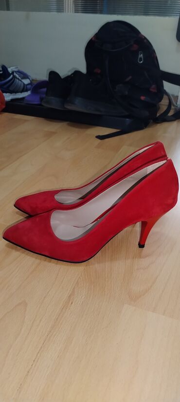 Elegantne ženske salonke u jarko crvenoj boji. - Model: klasične špic salonke - Materijal gornjišta: meka antilop/brušena koža - Unutrašnjost: glatka podstava, udoban uložak - Potpetica: visoka i ...